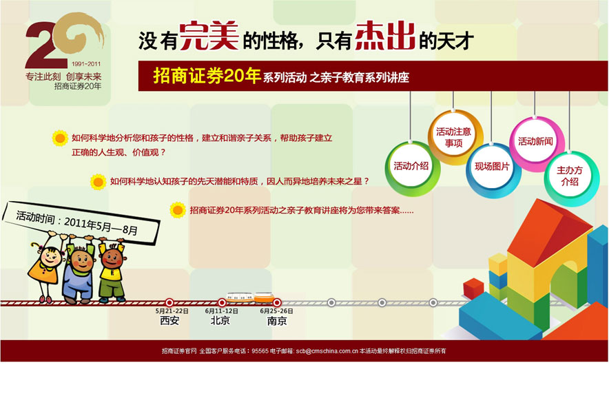 招商证券-亲子教育 为庆祝招商证券成立20周年,招商证券和深圳音乐厅一起精心策划了"缤纷夏日演出季",与客户、员工、合作伙伴、社会公众一起,分享非凡的艺术之美,华章之悦。并借此希望更多百姓、喜欢音乐的人们能够走进音乐厅,感受音乐的魅力,让高雅音乐在大众中普及。此次活动结合网络宣传及推广,进一步扩大影响力。 返回列表>> 上一篇:招商证券-音乐季 下一篇:招商证券-实盘投资大赛